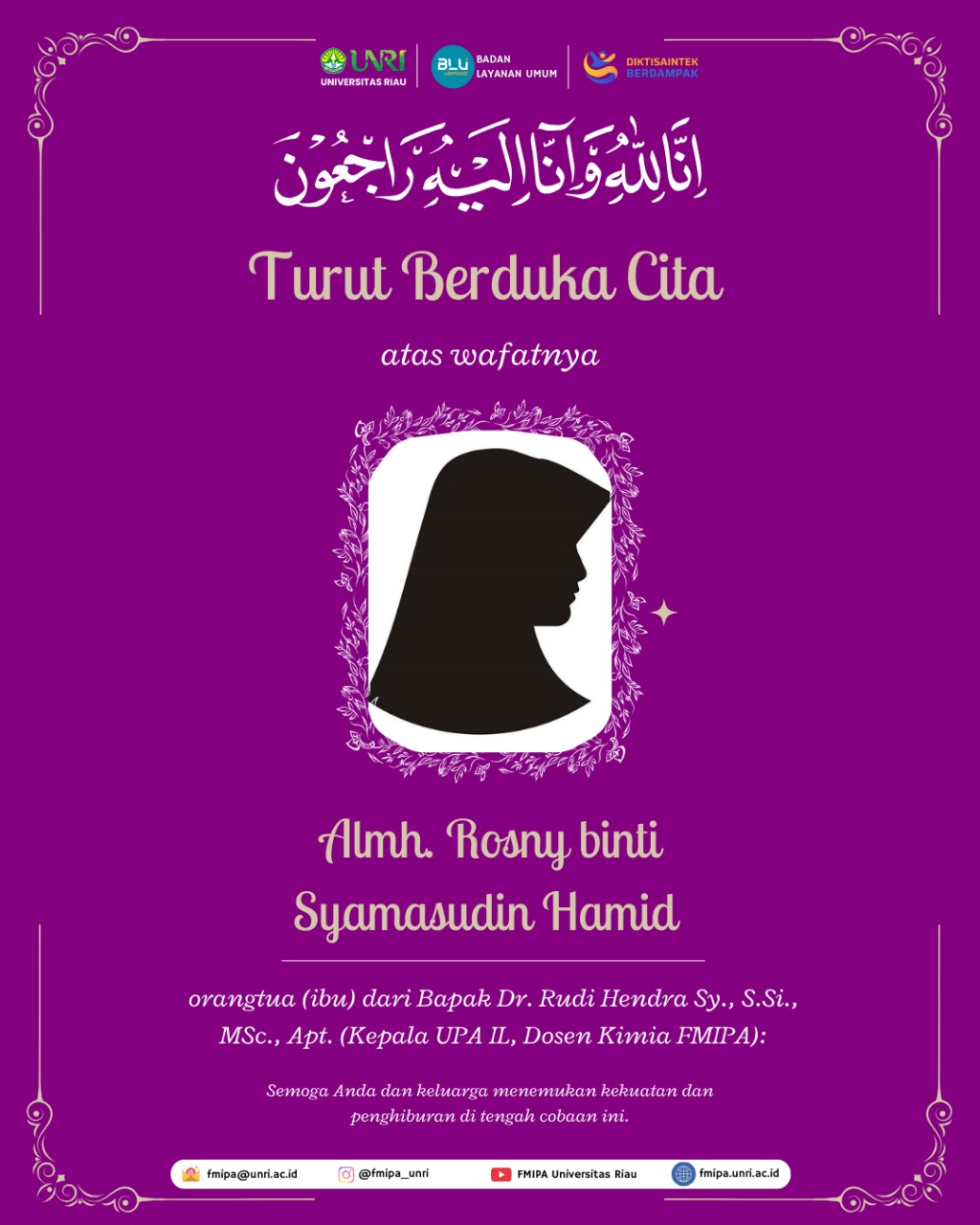 The late Rosny binti Syamasudin Hamid, mother of Dr. Rudi Hendra Sy., S.Si., M.Sc., Apt. (Head of UPA IL and Lecturer in Chemistry, Faculty of Mathematics and Natural Sciences), has passed away on Monday, September 22, 2025, at 7:59 PM WIB at Santa Maria Hospital.