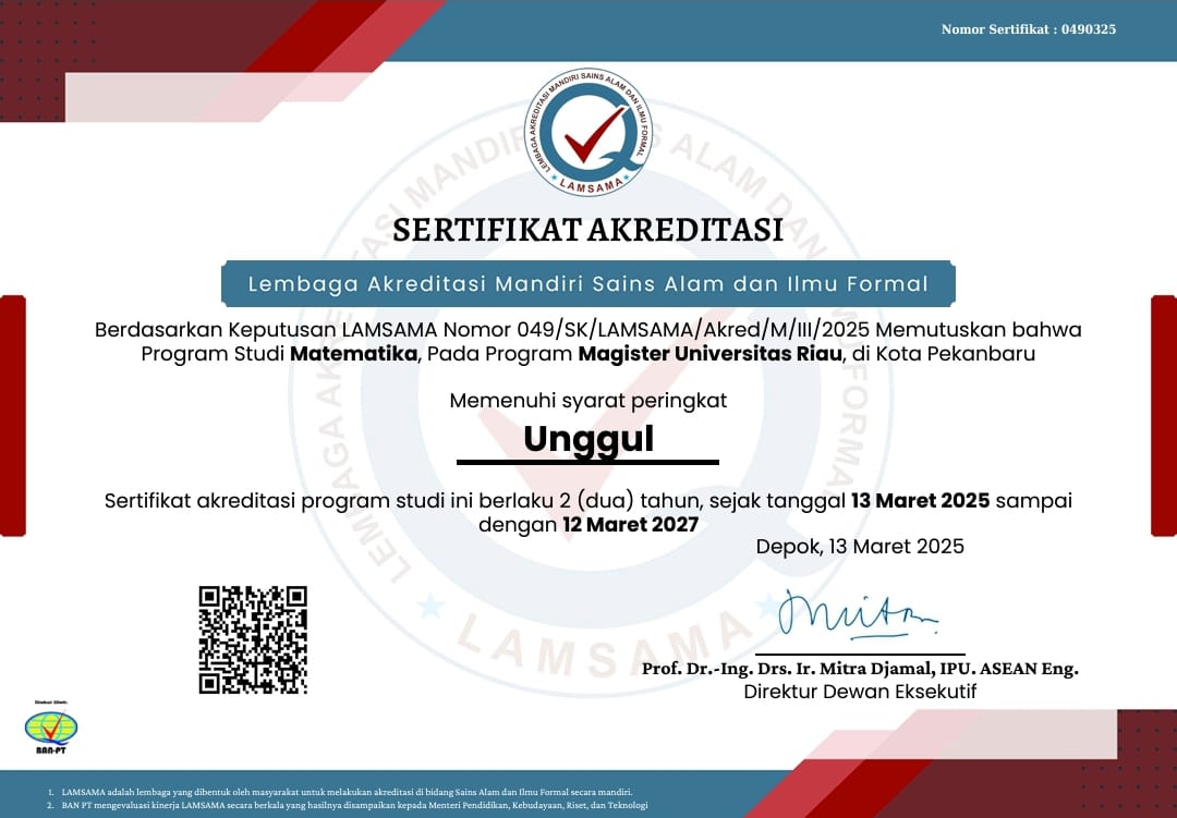 The Master Program (S2) in Mathematics, Faculty of Mathematics and Natural Sciences (FMIPA) University of Riau (UNRI), officially won the title of Superior Accreditation from the National Accreditation Board for Higher Education (BAN-PT). This achievement is proof of the study program's commitment to maintaining academic quality, research, and contribution to society.